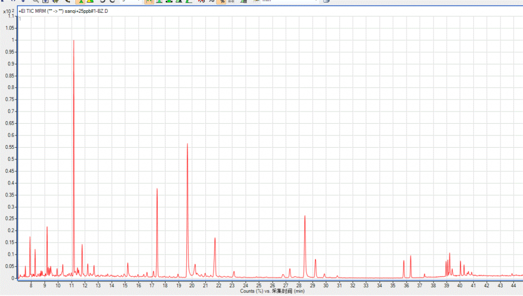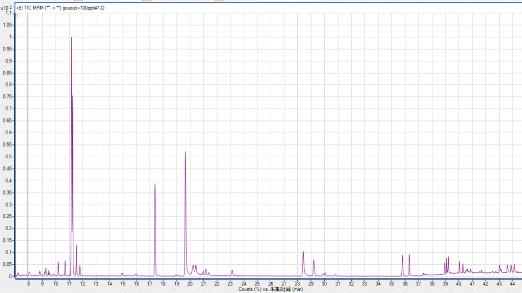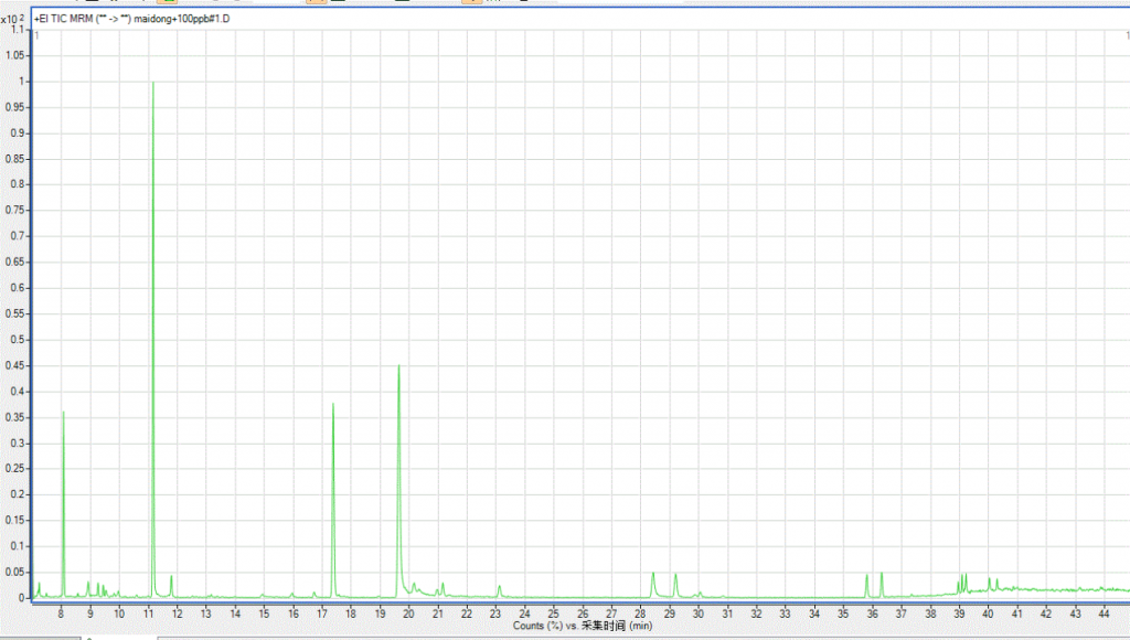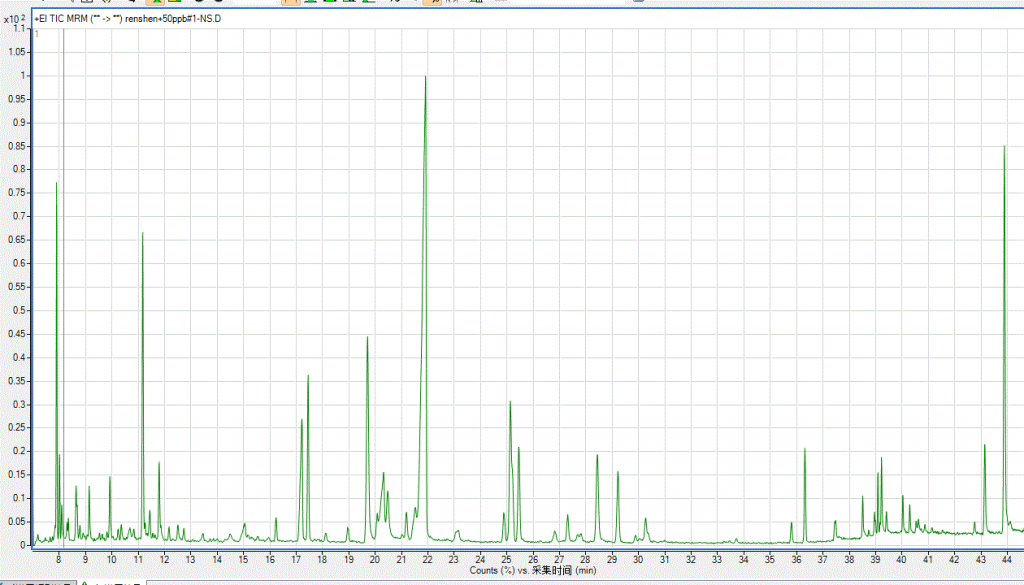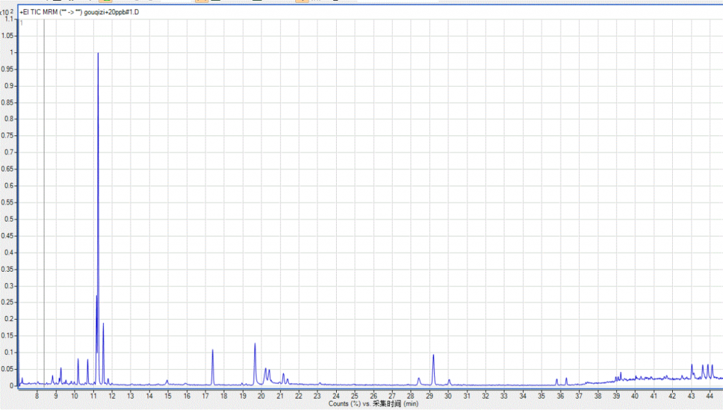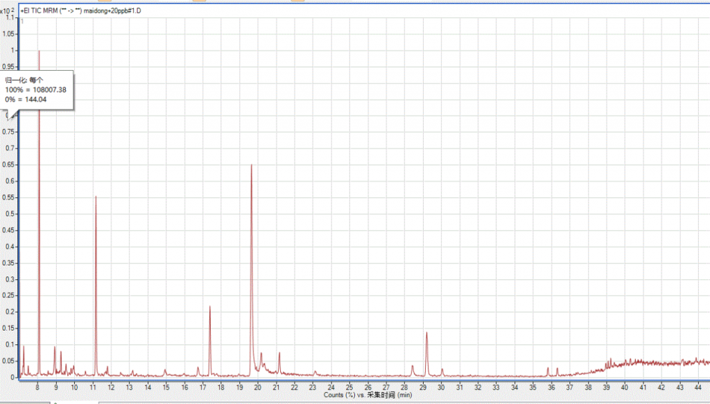 图9添加水平为0.1mg/kg麦冬样品中农药残留量的TIC图(GC-MS/MS)