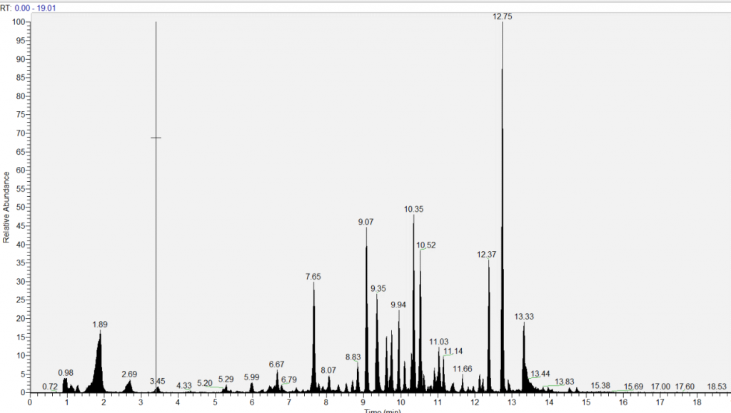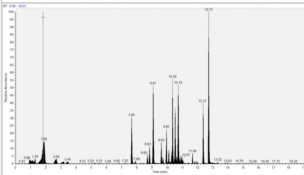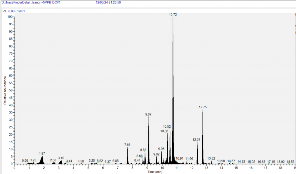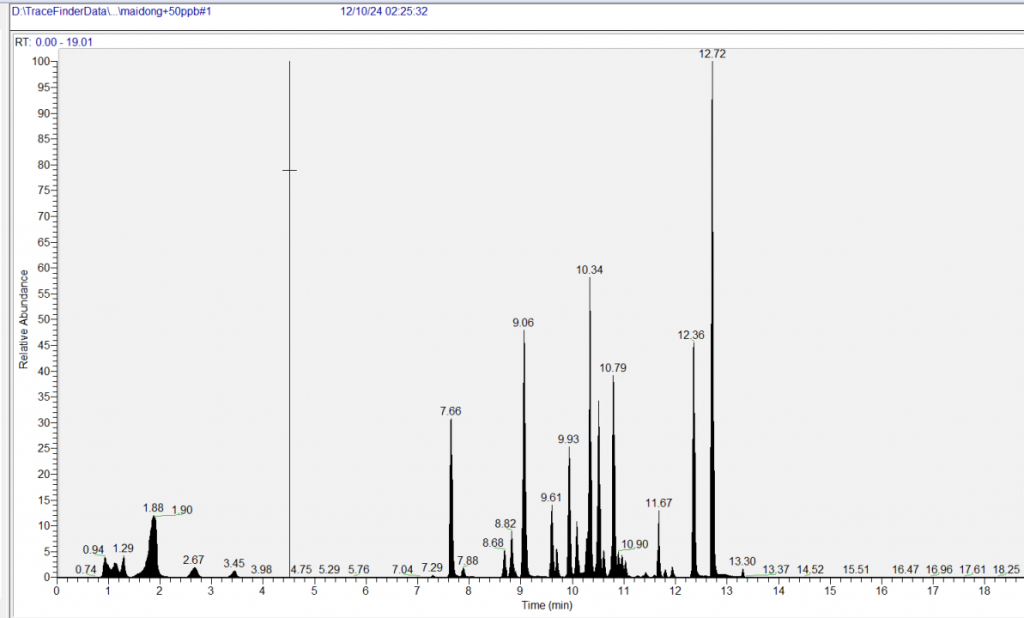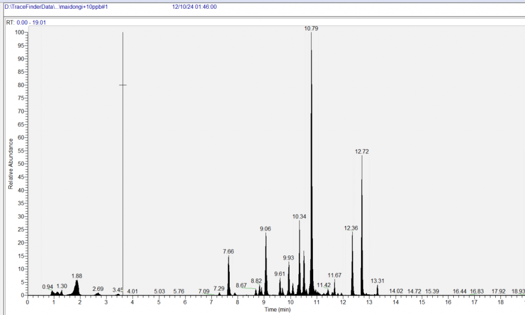 图9添加水平为0.1mg/kg麦冬样品中农药残留量的TIC图(GC-MS/MS)