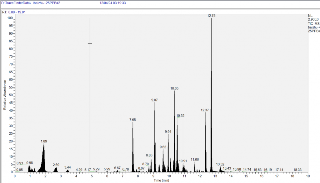 图15 添加水平为0.1mg/kg白术样品中农药残留量的TIC图(LC-MS/MS)