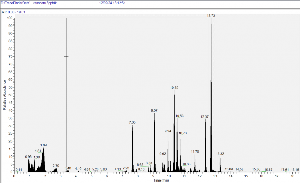 图12 添加水平为0.5mg/kg三七样品中农药残留量的TIC图(LC-MS/MS)