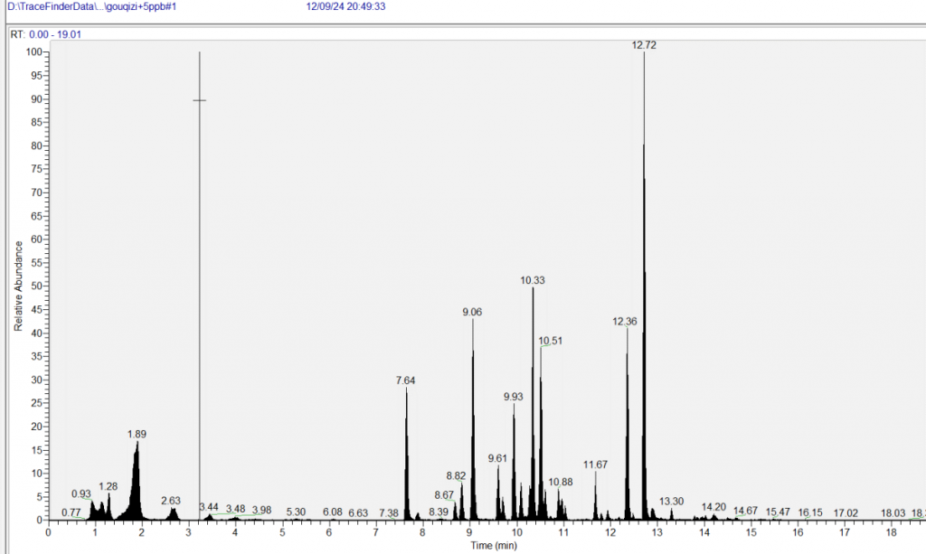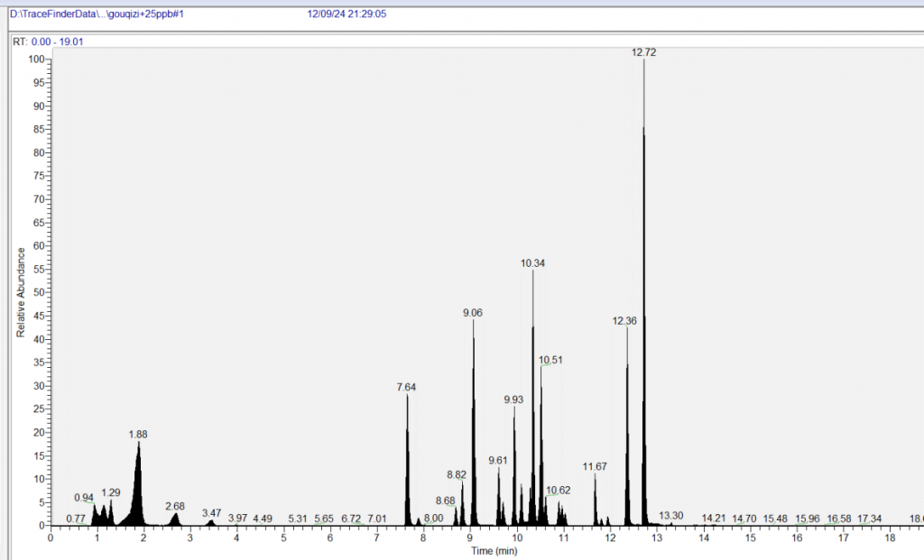 图4 添加水平为0.5mg/kg枸杞子样品中农药残留量的TIC图(LC-MS/MS)