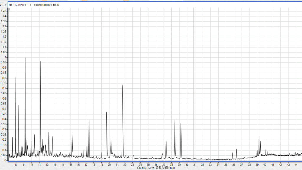 图14 添加水平为0.5mg/kg三七样品中农药残留量的TIC图(GC-MS/MS)