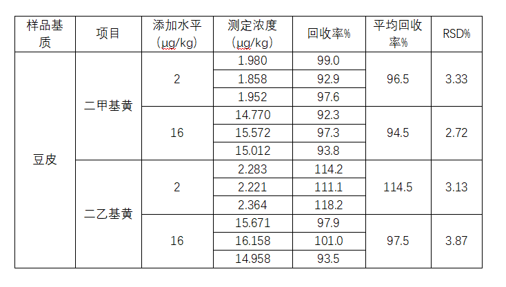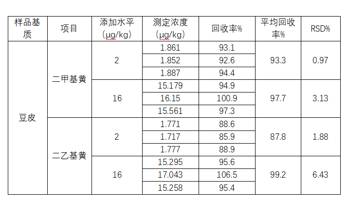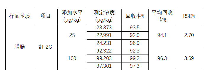 针对《BJS202505调味品、豆制品、肉制品等食品中红2G、二甲基黄、二乙基黄的测定》标准,逗点生物选取了豆皮和腊肠2种食品基质完成了方法验证工作,方法验证结果显示,加标回收率均大于85%。