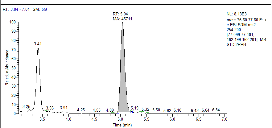 氮吹复溶:将洗脱液于40℃下氮吹至近干,精密加入1mL 乙酸铵(10mmol/L):乙腈=1:1溶液复溶,过0.22μm亲水PTFE滤膜,上机测试。
